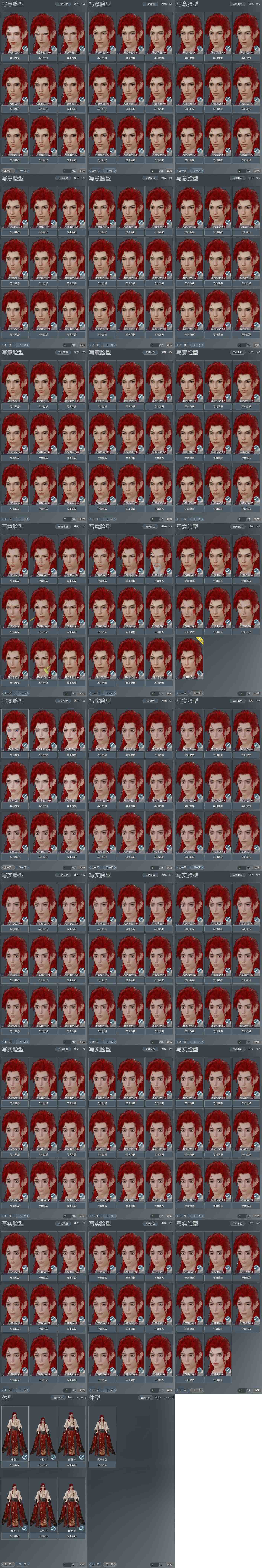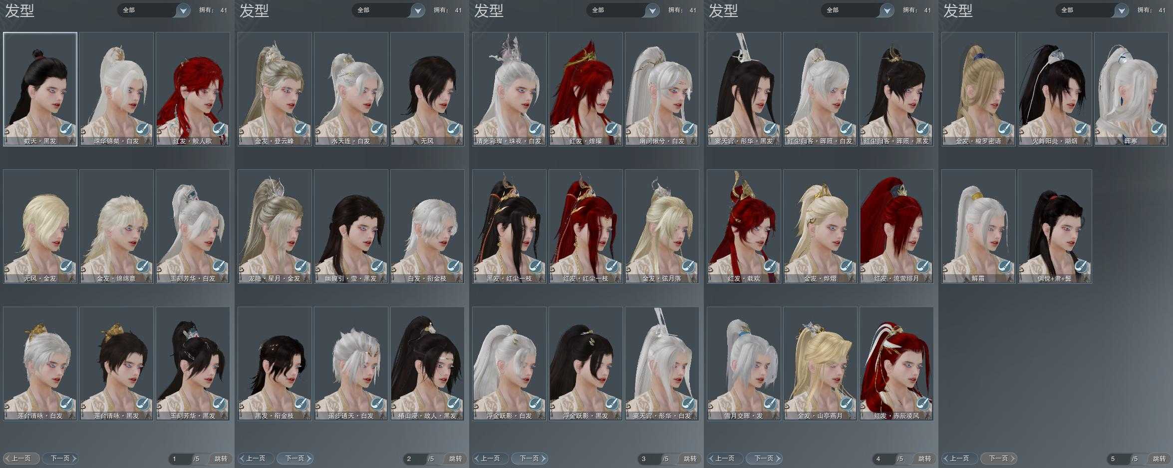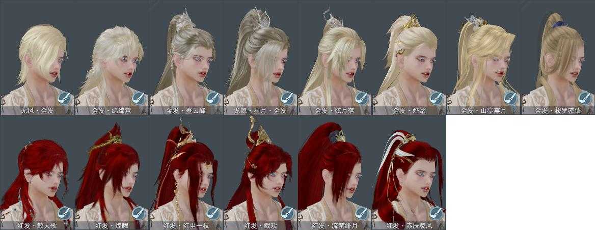 【发型】金发8个[资历金, 国金, 飒金, 巴卡金, 三代金, 咩金, 无风金发, 紫龙隐金发], 红发6个[八红, 十二红, 牛红, 兔红, 小资历红, 十五红], 黑发12个, 白发14个, 盒子发型[雪月白发, 黑红尘黑发, 白狮黑发, 小金龙黑发, 黑红尘白发, 白狮白发, 小金龙白发, 十二黑, 幽涧愀兮白发, 黑椿山黑发, 粉钻石盒白发, 白幽馥黑发, 西游盒白发, 莲台盒黑发, 莲台盒白发], 总页数5