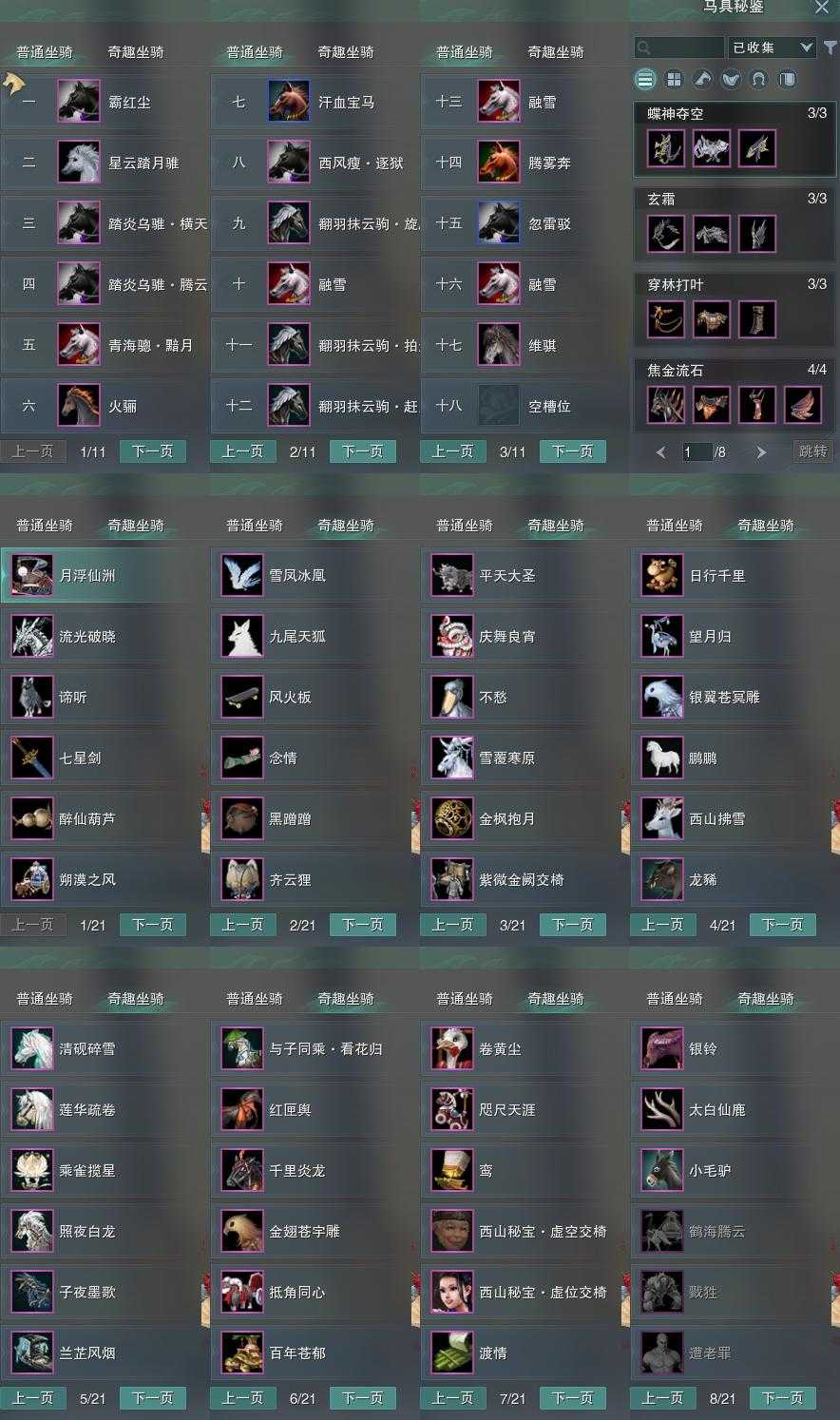 【坐骑】17个[踏炎横天, 踏炎腾云, 西风瘦逐狱, 星云踏月骓, 青海骢黯月, 翻羽抹云驹拍尘, 翻羽抹云驹旋风, 翻羽抹云驹赶月, 维骐, 霸红尘]