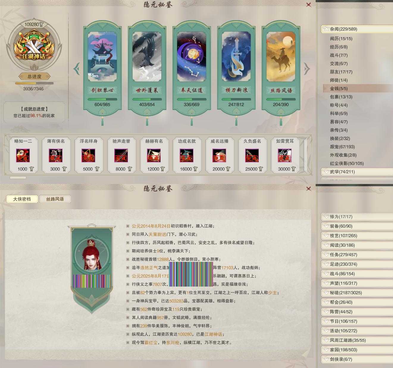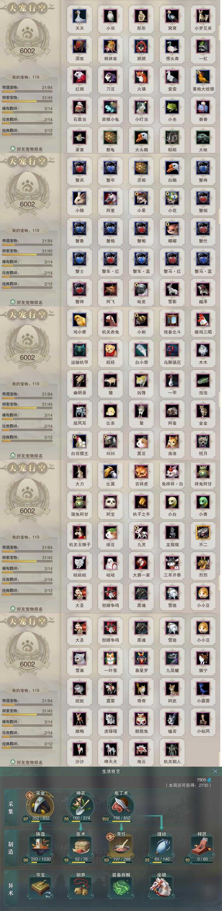 【同伴】李星云80级境界壹,康宴别79级境界壹,沐晴柔79级境界壹,唐小珂78级境界贰,月嘉禾78级境界壹,贺闲78级境界壹,白鹊78级境界壹,盖聂78级境界壹,卫庄78级境界壹,李逍遥77级境界壹,沈剑心76级境界贰,年小熊71级境界壹,温折枝66级境界壹,燕子娘65级境界壹,阮归云63级境界壹,费大劲60级境界壹,年小鹿55级境界壹,温辞秋50级境界壹,阮闲舟42级境界壹,茸茸1级境界壹