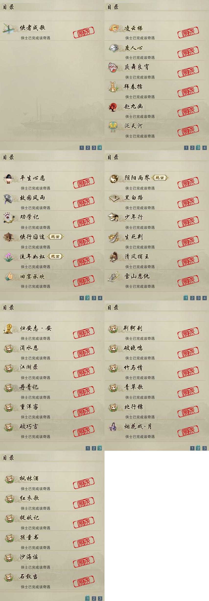 【奇遇】19个[劝学记, 阴阳两界, 雪山恩仇, 平生心愿, 黑白路, 少年行, 故园风雨, 流年如虹, 清风捕王, 侠行囧途, 庆舞良宵, 生死判, 凌云梯, 度人心, 赴九幽, 旧宴承欢, 泛天河, 侠者成歌, 拜春擂]