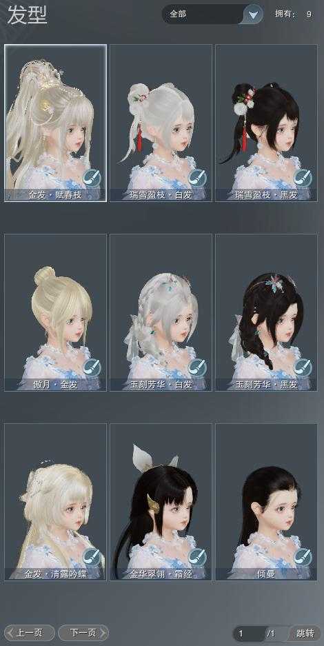 【发型】金发3个[水母金, 傲月金发, 蛇金], 红发0个[], 黑发3个, 白发2个, 盒子发型[瑞雪盒黑发, 瑞雪盒白发], 总页数1