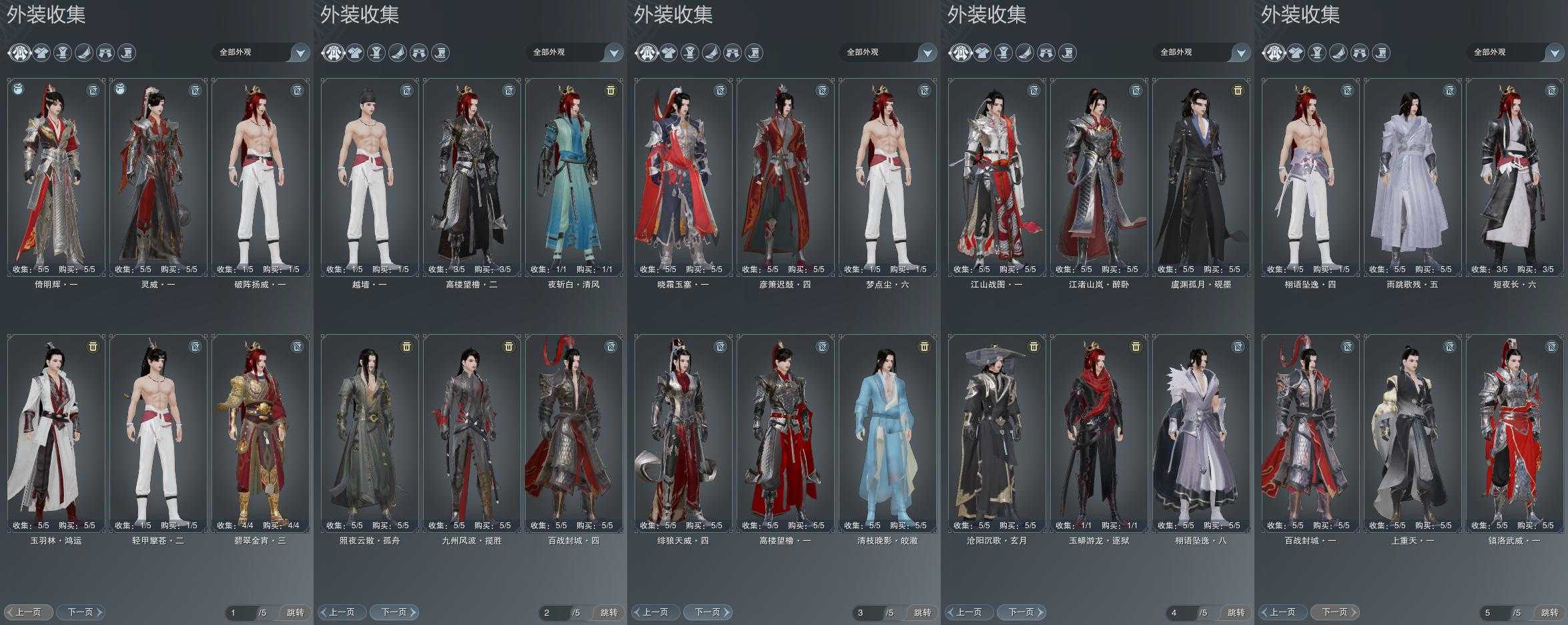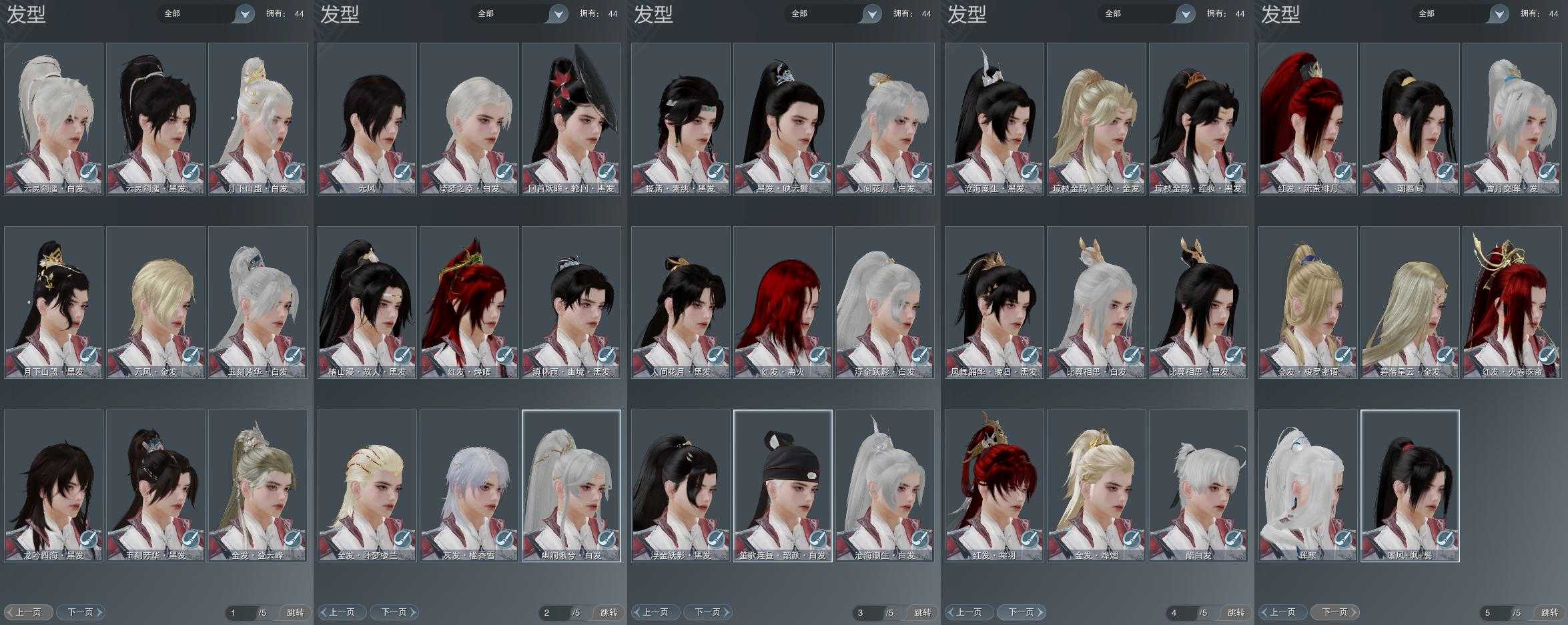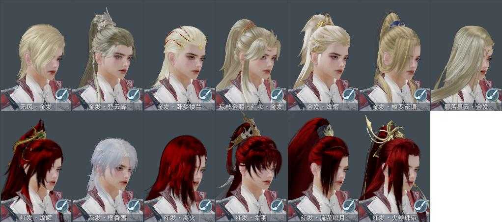 【发型】金发7个[资历金, 苏金, 猪金, 女仆金, 三代金, 无风金发, 红琼枝金发], 红发6个[六红, 十红, 兔红, 小资历红, 大资历红, 一代灰], 黑发17个, 白发13个, 盒子发型[雪月白发, 五代七夕黑发, 五代七夕白发, 晚日黑发, 红琼枝黑发, 沧海黑发, 沧海白发, 小金龙黑发, 唐风韶颜白发, 小金龙白发, 芙蓉黑发, 芙蓉白发, 白懒猪黑发, 幽涧愀兮白发, 黑傣族黑发, 黑椿山黑发, 红黑妖眸盒黑发, 婚纱盒白发, 龙吟盒黑发, 九七黑发, 九七白发, 仙剑黑发, 仙剑白发], 总页数5