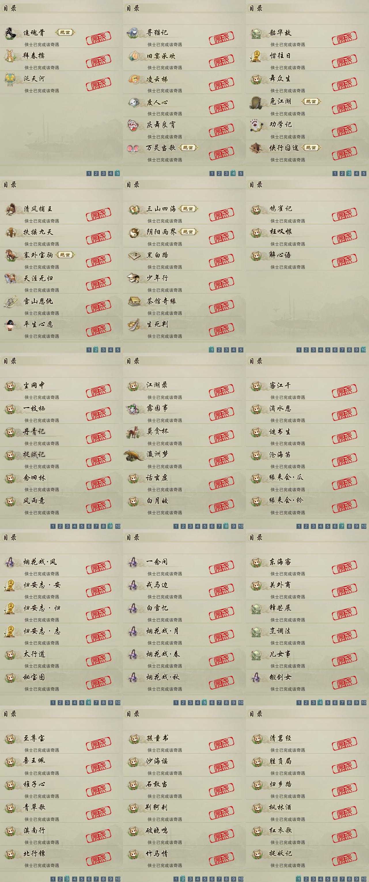【奇遇】27个[天涯无归, 三山四海, 劝学记, 雪山恩仇, 阴阳两界, 兔江湖, 平生心愿, 黑白路, 惜往日, 塞外宝驹, 韶华故, 少年行, 扶摇九天, 舞众生, 清风捕王, 寻猫记, 侠行囧途, 茶馆奇缘, 庆舞良宵, 万灵当歌, 生死判, 凌云梯, 追魂骨, 度人心, 旧宴承欢, 泛天河, 拜春擂]