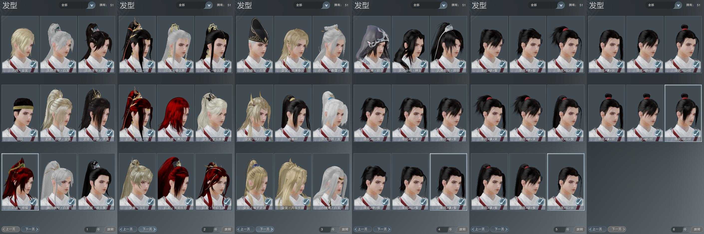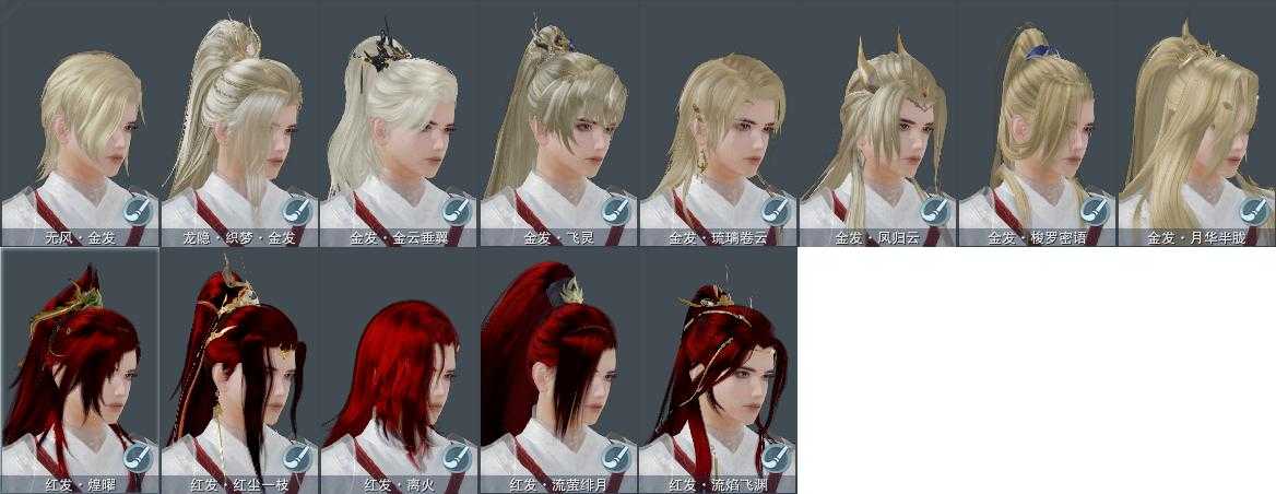 【发型】金发8个[资历金, 鸡金, 狗金, 龙女金, 飒金, 苍金, 无风金发, 白龙隐金发], 红发5个[九红, 十二红, 兔红, 小资历红, 大资历红], 黑发10个, 白发7个, 盒子发型[一代花朝白白, 狄仁杰白, 雪月白发, 十二黑, 哒黑, 哒白, 幽涧愀兮白发, 白龙隐黑发], 总页数6