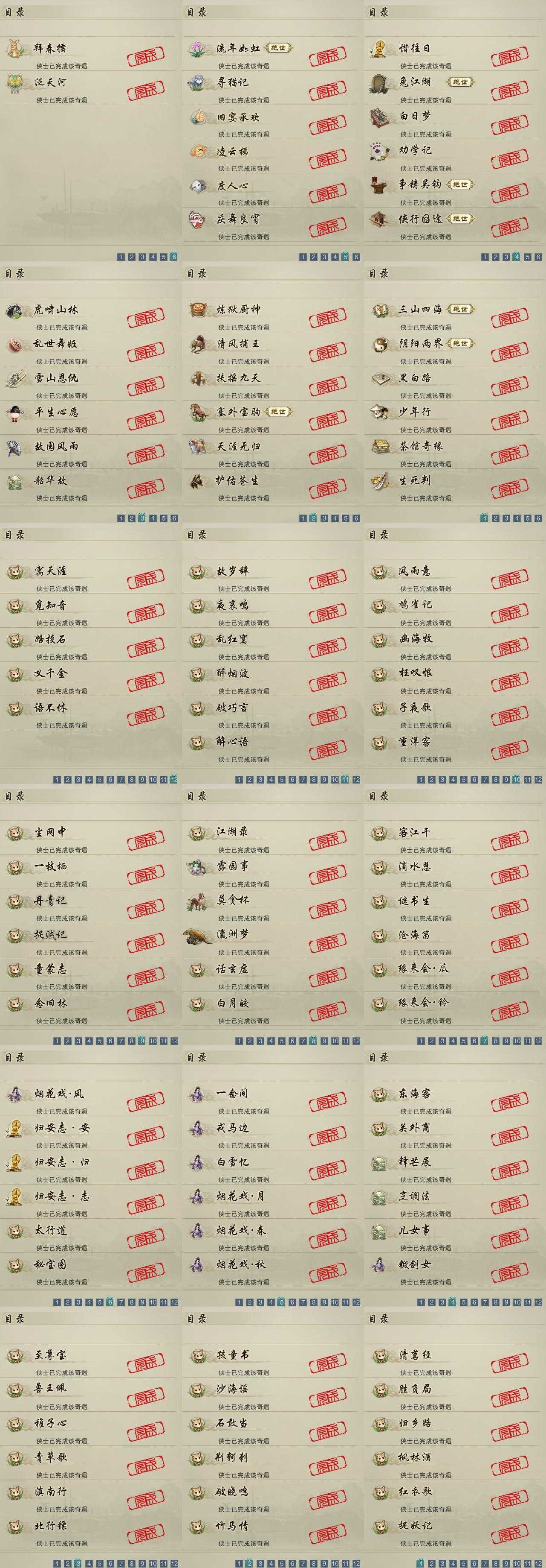 【奇遇】32个[白日梦, 天涯无归, 三山四海, 劝学记, 雪山恩仇, 阴阳两界, 兔江湖, 平生心愿, 黑白路, 惜往日, 乱世舞姬, 塞外宝驹, 争铸吴钩, 虎啸山林, 韶华故, 护佑苍生, 少年行, 故园风雨, 扶摇九天, 流年如虹, 清风捕王, 寻猫记, 侠行囧途, 茶馆奇缘, 庆舞良宵, 生死判, 凌云梯, 炼狱厨神, 度人心, 旧宴承欢]